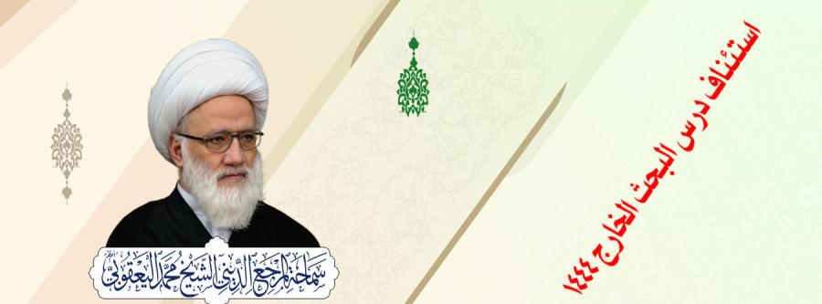 يستأنف سماحة المرجع الديني الشيخ محمد اليعقوبي (دام ظله) درسه الخارج في الساعة العاشرة والربع صباحاً, إبتداءاً من يوم السبت 4/ربيع الأول/1444هـ الموافق 1/10/2022 في مؤسسة الامام الباقر (عليه السلام) بإذنه تعالى.